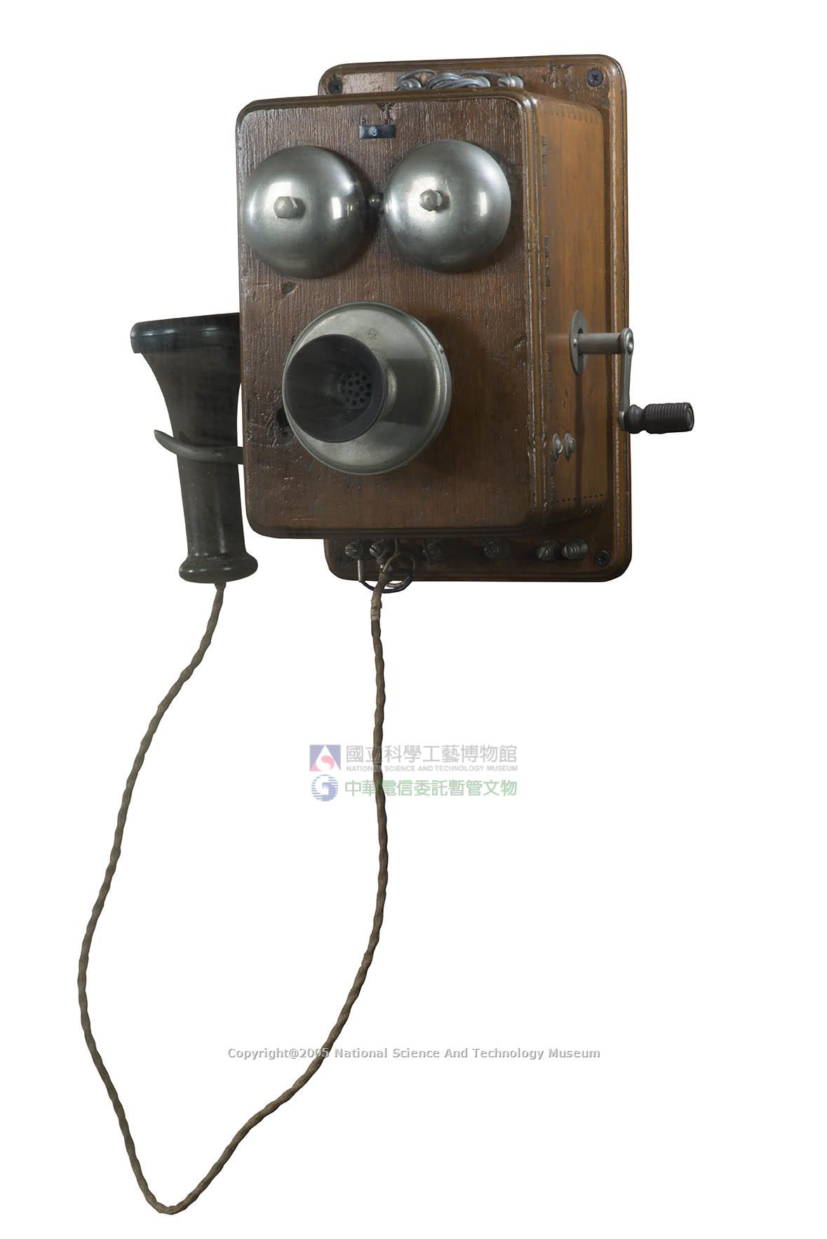曲柄手搖磁石式電話機(俗稱搖把子),利用手搖把之轉動使線圈切割磁場來感應發電,構成迴路電流而向受話方振鈴。本體上有兩個電鈴,其振鈴聲音由連續搖轉的速度、持續時間及次數決定振鈴聲強度、久暫與振鈴次數。適合家庭、公司行號或機關通信用。